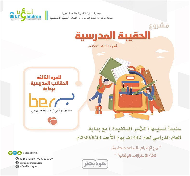 أطلقت جمعية أبناؤنا الخيرية بمنطقة المدينة المنورة مشروعها السنوي الثالث "الحقيبة المدرسية"، بالتعاون مع صندوق موظفي سابك الخيري.، تم توزيع أكثر مِن 250 حقيبة مدرسية تتضمن مختلف المستلزمات المدرسية التي يحتاجها الطالب في المراحل التعليمية الثلاث، مُشيرةً إلى أن مشروع الحقيبة المدرسية من المشاريع السنوية التي تنفذها الجمعية ضمن برنامج الرعاية التعليمية للأبناء، الذي يهدف إلى مساعدتهم في تحصيلهم الدراسي..