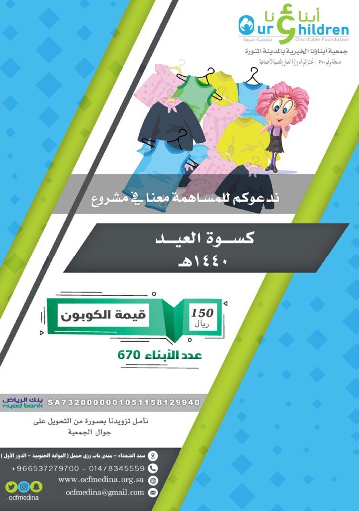 مشروع كسوة العيدتعد "كسوة العيد" من المشاريع الخيرية والإنسانية، التي تنفذها الجمعية خلال عيد الفطر ، ويستفيد منها الابناءالمسجلين بخدماتالجمعية، انطلاقاً من تعزيز دورها المجتمعي والعمل الإنساني ومسؤوليتها تجاه الابناء لإدخال الفرحة إلى قلوبهم ورسم الابتسامة على وجوههم وغرس السعادة في نفوسهم.عدد الابناء المستفدين من المشروع.